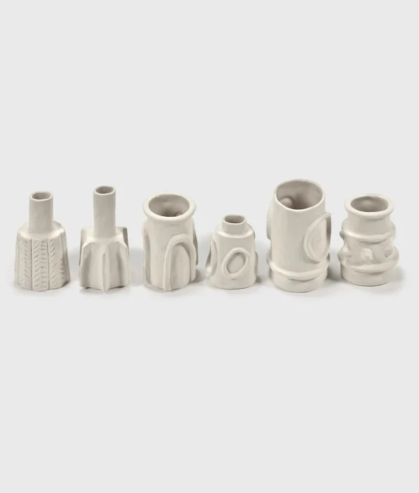 Kleine Serax Aardewerk Vazen, Ontworpen Door Marie Michielssen. Set Van 6 Stuks. Uitgevoerd In Gebroken Wit, Mat Aan De Buitenkant, Geglazuurd Aan De Binnenkant. De Molly Vazen En Potten Zijn Een Grafische Blikvanger In Elk Interieur. De Vazen Worden Met De Hand Afgewerkt, Waardoor Ieder Stuk Uniek Is. Afmeting: L 6,5 B 5 H 11 Cm.